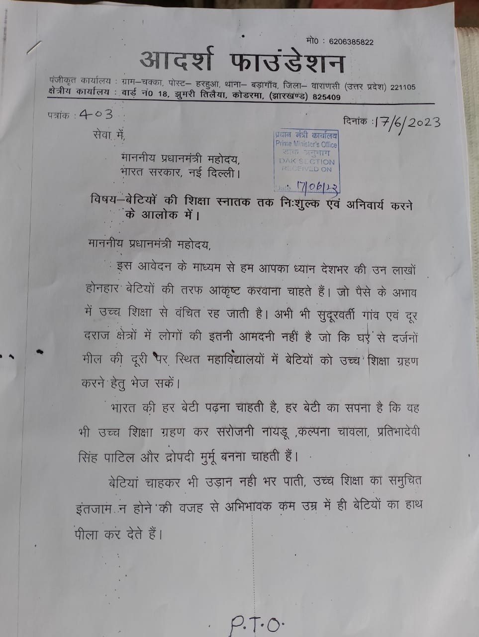 बेटियों की शिक्षा स्नातक तक निःशुल्क एवम अनिवार्य करने को लेकर पी.एम.को लिखा पत्र