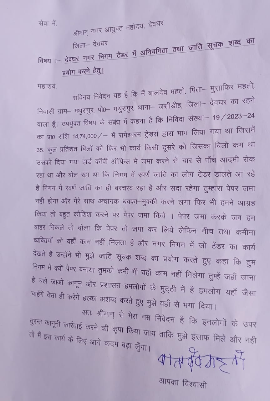 देवघर : पीड़ित ने नगर आयुक्त को दिया आवेदन, गाली गलौज करनें का लगाया आरोप